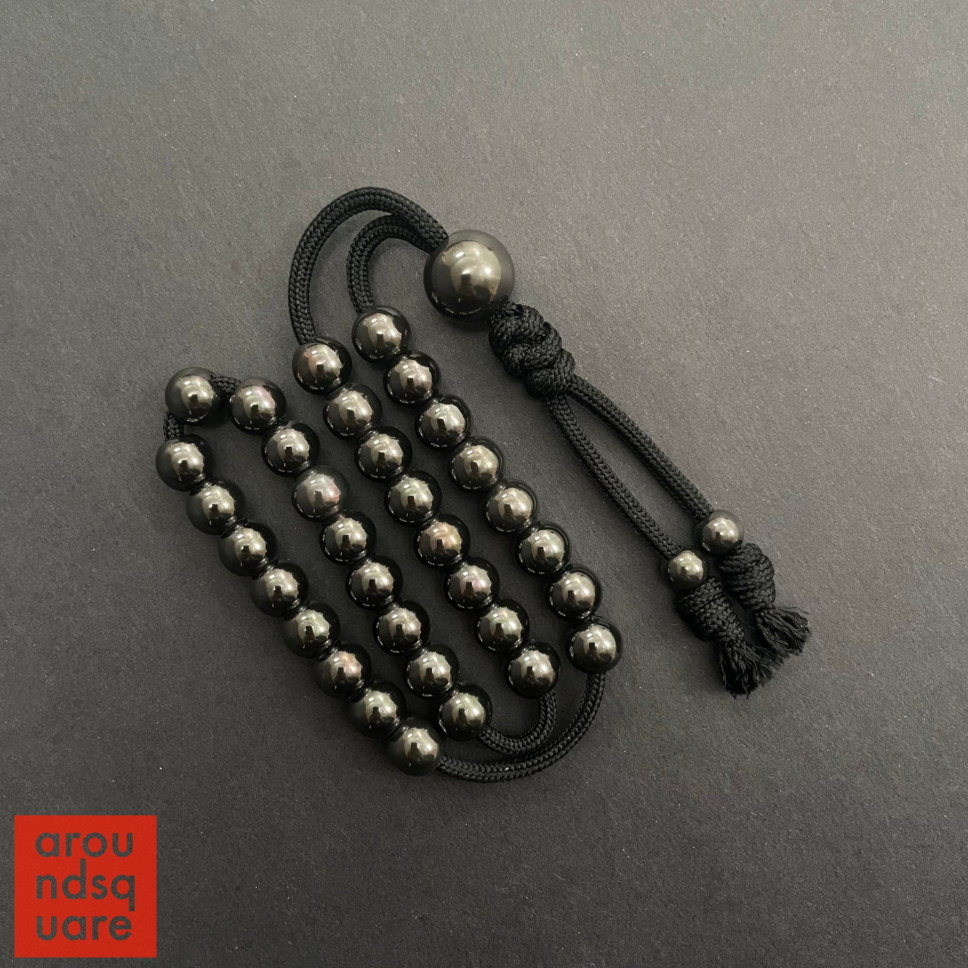 The unique setup of the MKUltras allows them to be worn like mala beads, or carried discretely in the pocket. They adjust by means of a simple friction fit through the larger "Boss" bead closure. Although the design is exceedingly simple, we're fairly confident you won't find anything quite like them around. This is a knotless system, and does not require any special lock bead. The cord is simply compressed when threaded through the Boss bead, providing a reliable, secure fastener, that is easy to adjust when needed.